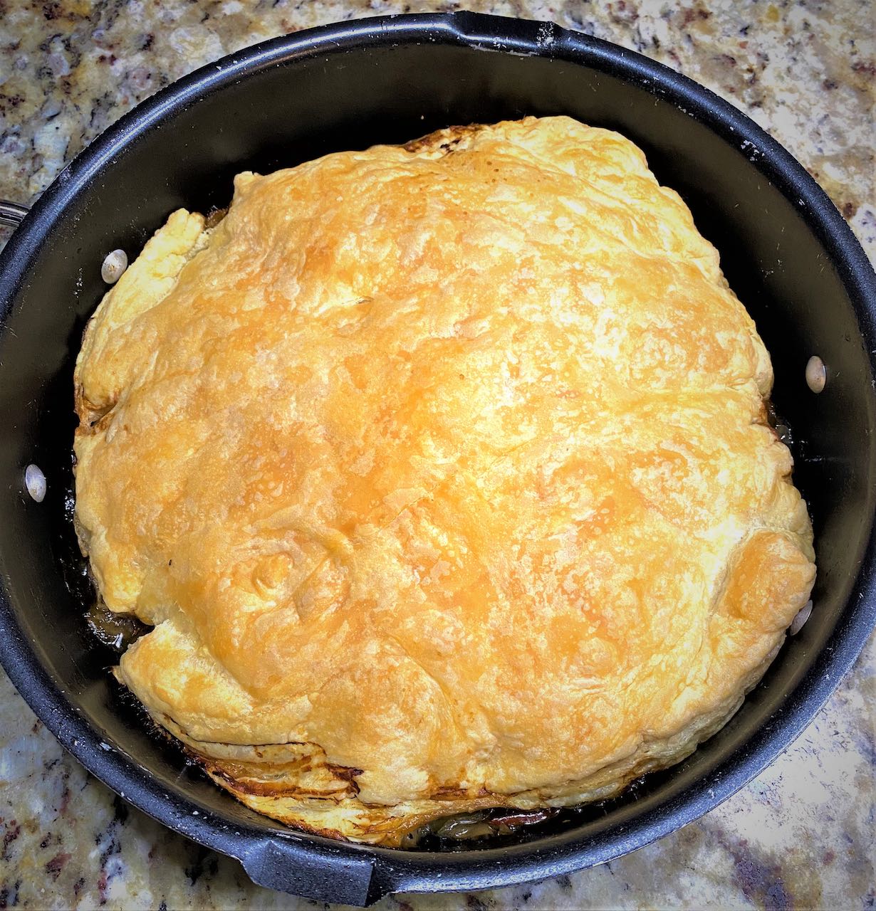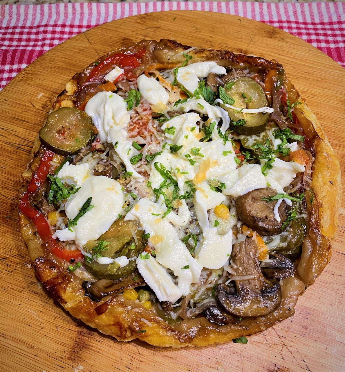 Retiramos del fuego y colocamos sobre los vegetales cocidos, una lámina de puff pastry o masa de hojaldre metiéndola bien por los bordes del sartén y hornear a 350°F por 30 minutos o hasta que este dorada la masa. Retirar del horno y con ayuda de una paleta despegar los bordes y voltear en una madera o plato. Agregar pedacitos de queso mozzarella y disfrutar de esta delicia.