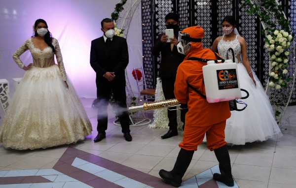 Un hombre con un traje de protección rocía desinfectante a dos parejas vestidas de novios dentro de un salón de baile tras un simulacro de boda luego del levantamiento parcial de las restricciones contra el COVID-19, en La Paz, Bolivia. (Foto: AP)