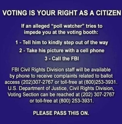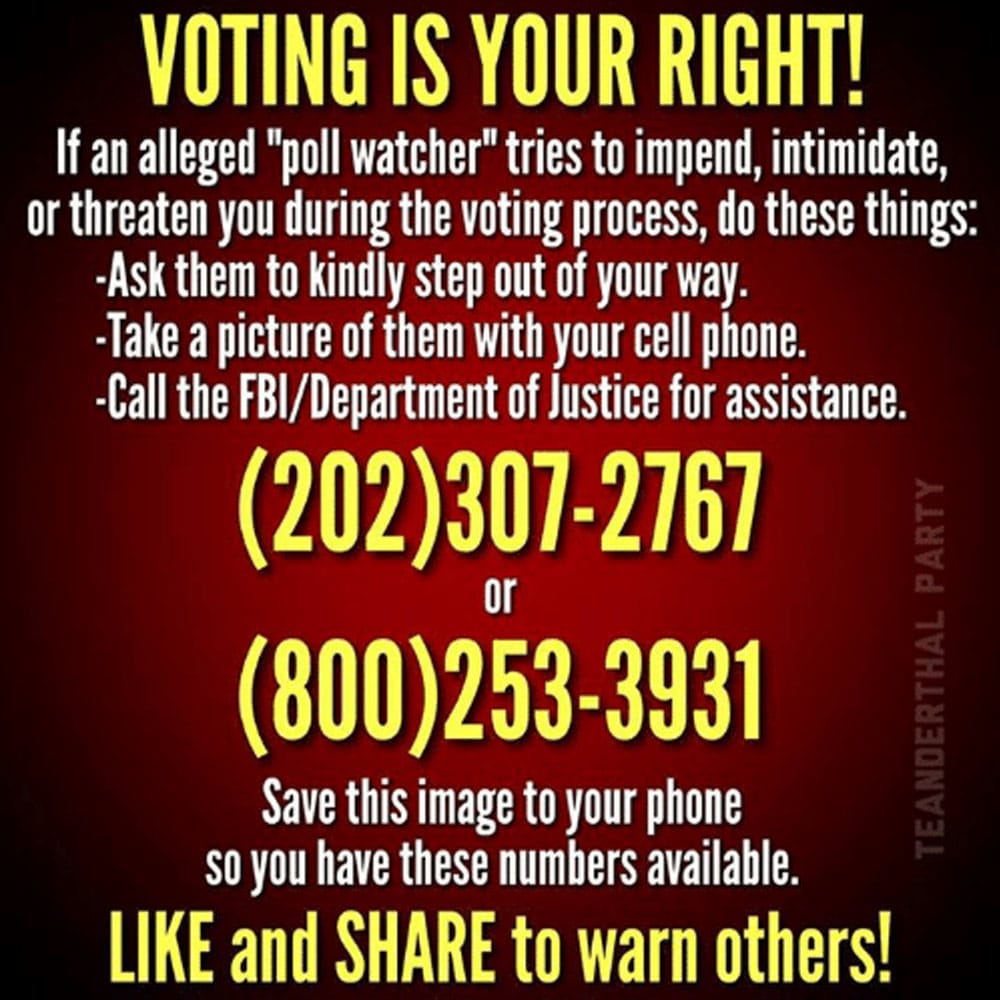Si un presunto "observador de encuestas" trata de obstaculizarle en la cabina de votación: 1 - Dígale amablemente que se aparte, 2 - Tómele una foto con un teléfono celular, 3 - Llame al FBI