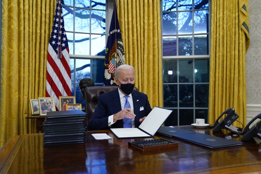 El presidente Joe Biden firma sus primeros decretos en la Oficina Oval de la Casa Blanca, el miércoles 20 de enero 2021, en Washington. (AP Foto/Evan Vucci)