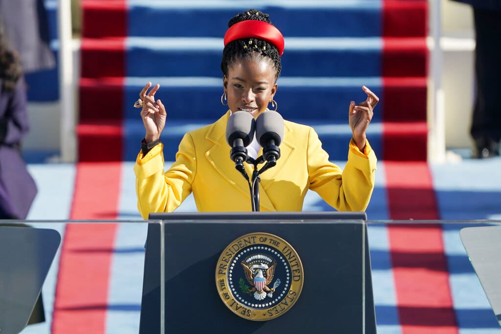 Amanda Gorman recita un poema durante la ceremonia de investidura del presidente Joe Biden frente al Capitolio estadounidense, en Washington, el miércoles 20 de enero del 2021. (AP Foto/Patrick Semansky, Pool)