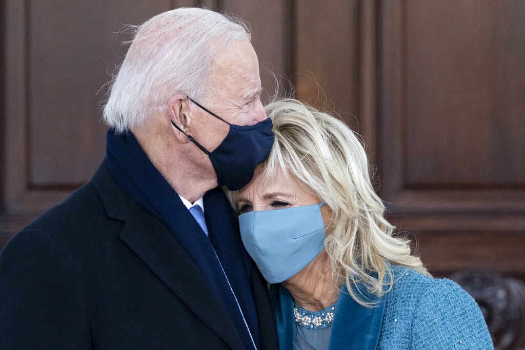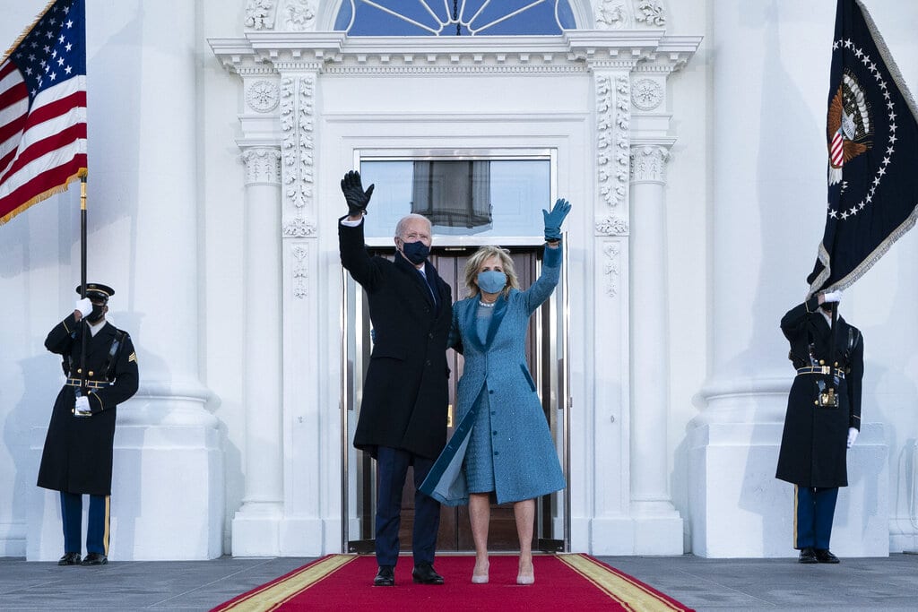 El presidente Joe Biden y la primera dama Jill Biden saludan al lelgar al Pórtico Norte de la Casa Blanca el míercoles 20 de enero de 2021 en Washington. (Foto AP/Alex Brandon, Pool)