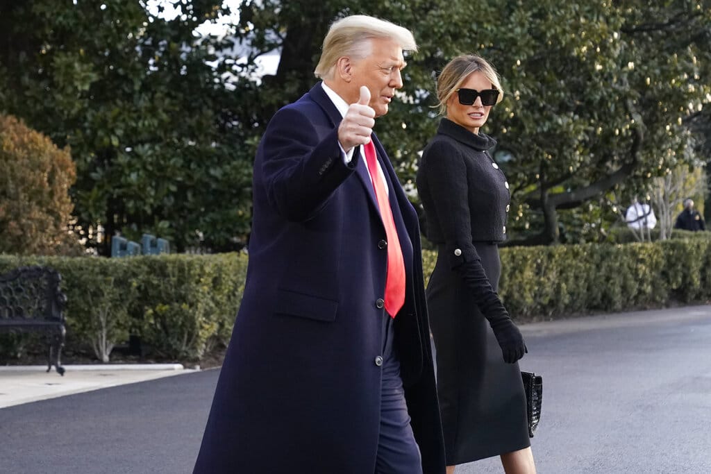 El presidente Donald Trump y la primera dama Melania Trump se dirigen hacia el Marine One en la Casa Blanca el miércoles 20 de enero del 2021 en Washington. Trump se dirige a su resort Mar-a-Lago Florida. (AP Foto/Alex Brandon)