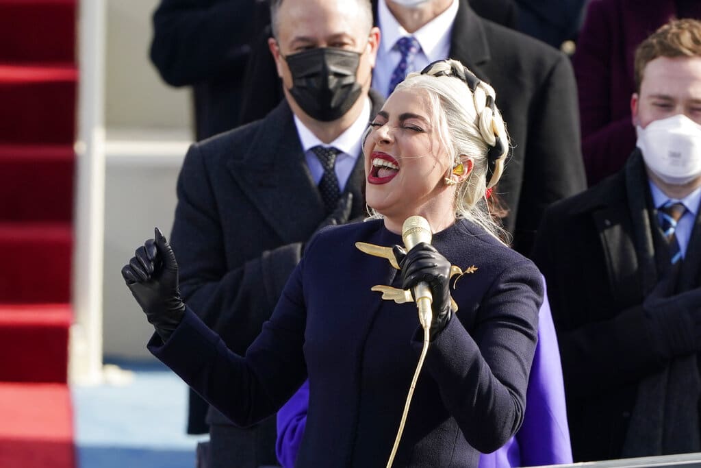 Lady Gaga canta el himno nacional durante la ceremonia de investidura del presidente Joe Biden frente al Capitolio estadounidense, en Washington, el miércoles 20 de enero del 2021. (AP Foto/Patrick Semansky, Pool)