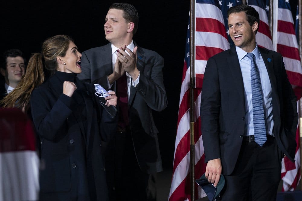 La consejera del presidente Hope Hicks aplaude mientras el presidente Donald Trump habla durante una manifestación de campaña en el Aeropuerto Internacional de Harrisburg, el sábado 26 de septiembre de 2020, en Middletown, Pensilvania. Asistente especial del presidente y director de viajes de la Casa Blanca, William Russell, centro y director de la oficina de personal de la Casa Blanca, John McEntee, mirando. (Foto AP / Evan Vucci)