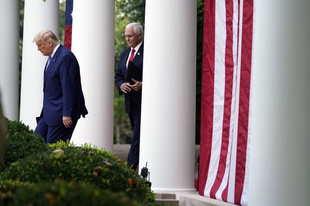 El presidente Donald Trump llega con el vicepresidente Mike Pence para hablar sobre las pruebas de coronavirus durante un evento en el jardín de rosas de la Casa Blanca, el lunes 28 de septiembre de 2020 en Washington. (Foto AP / Evan Vucci)