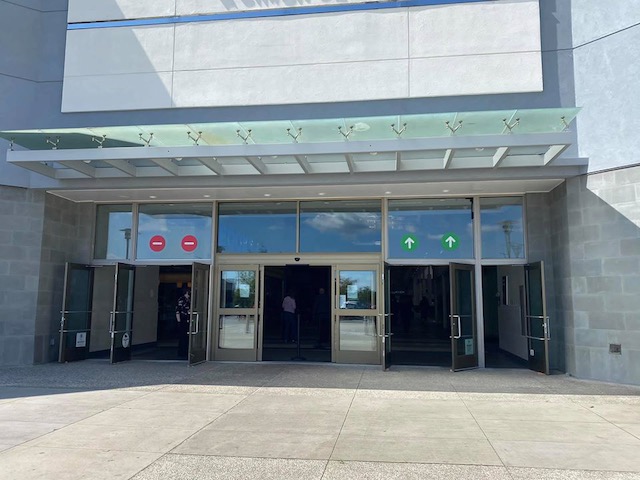 Cuando uno entra al centro comercial, se puede notar que algunas puertas están cerradas. Por ejemplo, en Concord Mills solo hay tres entradas abiertas. Hay dos puertas en las entradas, una para entrar y una para salir. El tráfico está dividido por una barrera en el centro.