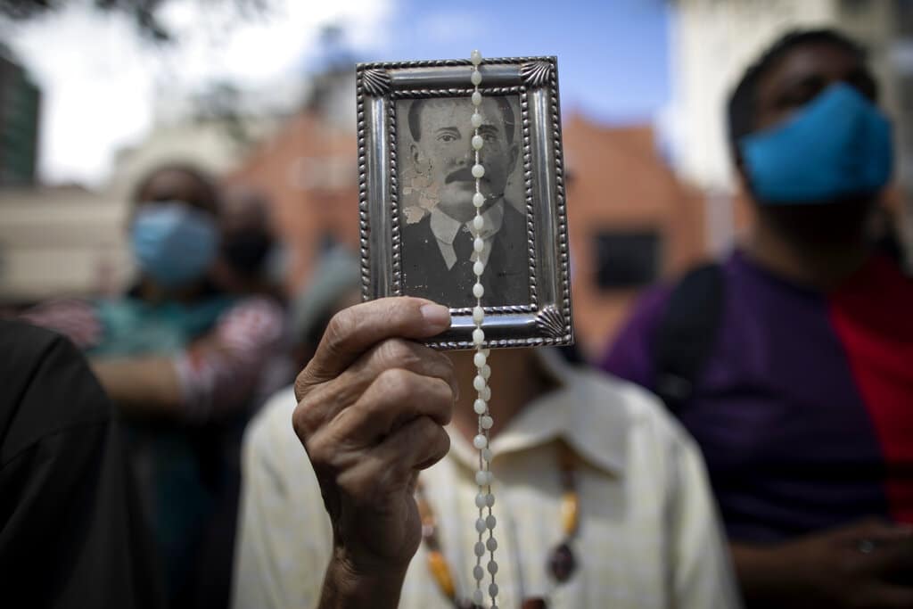 En esta imagen, tomada el 26 de octubre de 2020, una devota sostiene una imagen enmarcada del fallecido doctor José Gregorio Hernández en el exterior de la iglesia de La Candelaria donde están enterrados sus restos, en Caracas, Venezuela. Los restos de Hernández, conocido popularmente como el "doctor de los pobres", fueron exhumados el lunes en una ceremonia a puerta cerrada en la iglesia del centro de Caraca como parte de las exigencias del Vaticano para la beatificación del primer laico venezolano. (AP Foto/Ariana Cubillos)