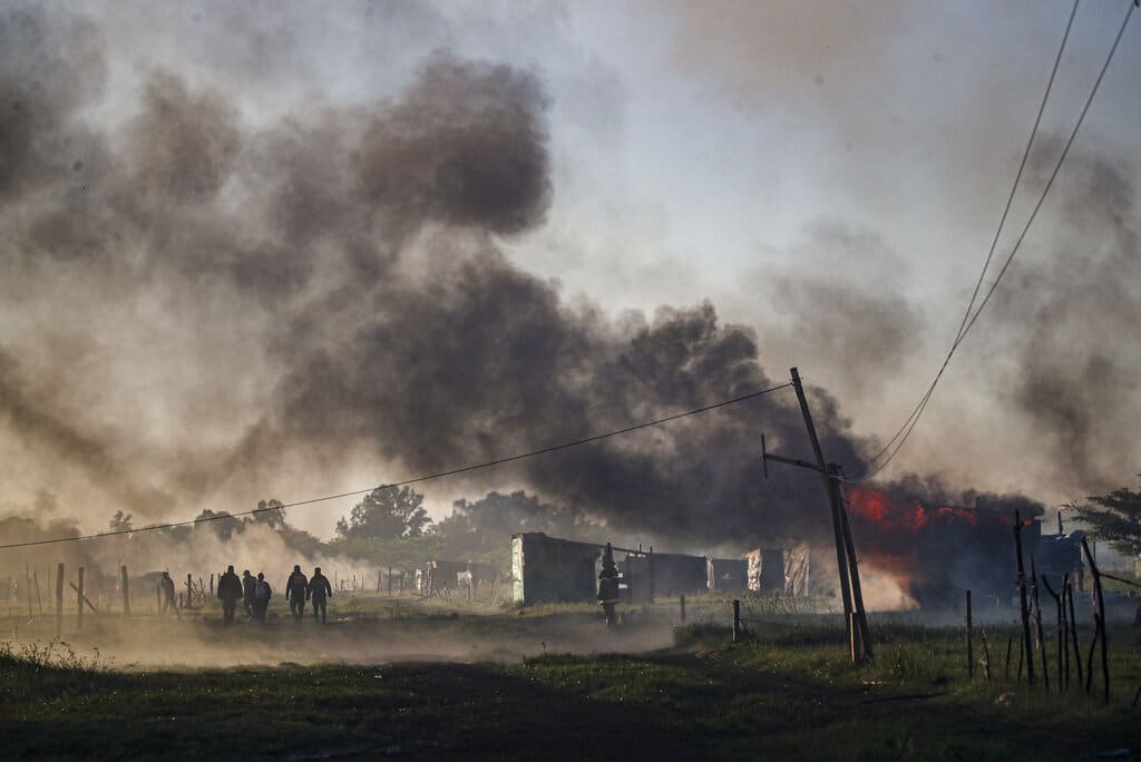 En esta imagen, tomada el 29 de octubre de 2020, agentes de policía desalojan a ocupantes ilegales en un asentamiento en Guernica, en la provincia de Buenos Aires, Argentina. La policía argentina se enfrentó a un grupo de manifestantes durante el desalojo de viviendas improvisadas en una disputada propiedad al sur de la capital. Cientos de familias llevaban más de tres meses viviendo en chozas instaladas en el terreno, reflejo de la creciente pobreza y de la falta de vivienda en el país. (AP Foto/Natacha Pisarenko)