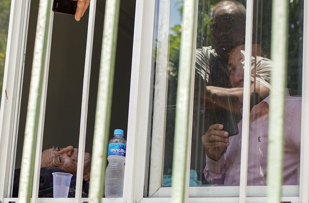 En esta imagen, tomada el 27 de octubre de 2020, el paciente Jose Silva (izquierda) espera a ser evacuado mientras los bomberos sofocan un incendio en el hospital federal Bonsucesso, en Río de Janeiro, Brasil. El fuego comenzó en el sótano de uno de los edificios del hospital y obligó a los equipos de emergencias a evacuar a al menos 200 enfermos, algunos de ellos en sus propias camas. Dos mujeres que estaban graves por COVID-19 murieron durante la evacuación, dijo el hospital. (AP Foto/Silvia Izquierdo)
