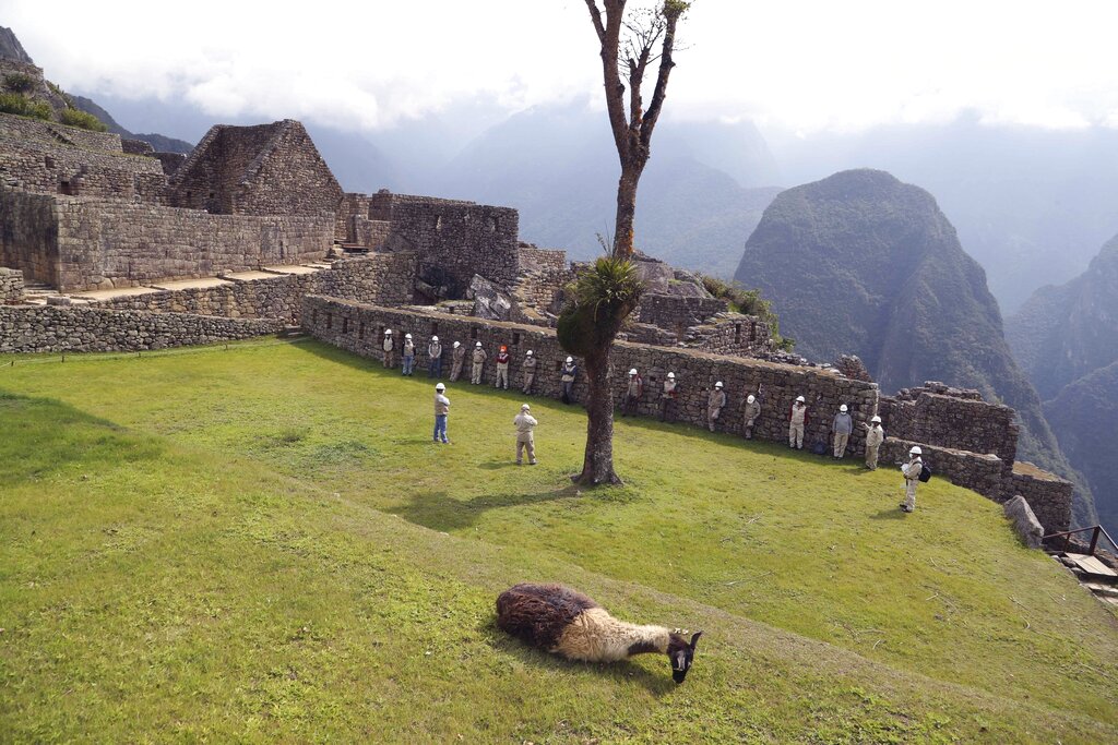 En esta imagen, tomada el 27 de octubre de 2020, una llama, tendida sobre la hierba en Machu Picchu mientras operarios de mantenimiento se preparan para comenzar a reparar carreteras y señales en la majestuosa ciudadela inca antes de su reapertura, en Cusco, Perú. El largo cierre de la principal atracción turística del país, que ha dañado la economía local, fue apenas el segundo desde su apertura al público en 1948. La primera vez fue en 2010 debido a unas prolongadas lluvias torrenciales. (AP Foto/Martín Mejía)