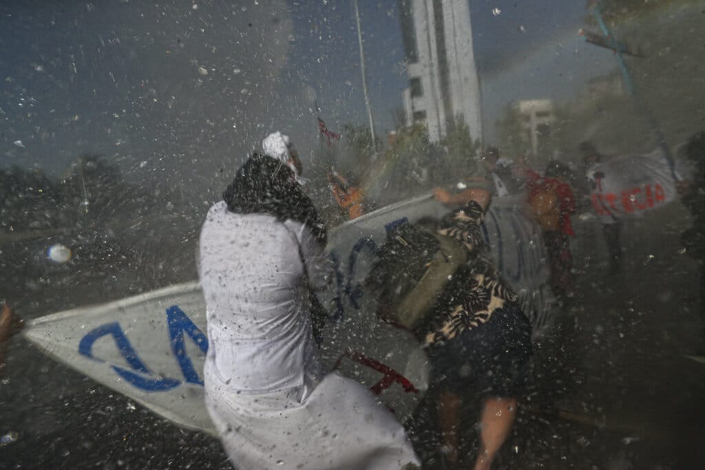 En esta imagen, tomada el 23 de octubre de 2020, una monja, empapada por los cañones de agua empleados por la policía para dispersar a manifestantes antigubernamentales que protestan contra la desigualdad dos días antes de un referéndum sobre la reforma de la Constitución chilena, que data de la dictadura militar de Augusto Pinochet, en Santiago, Chile. En un año marcado por la pandemia y el descontento, los chilenos decidieron por una abrumadora mayoría redactar una nueva Carta Magna que sustituya a la impuesta hace cuatro décadas por Pinochet. (AP Foto/Esteban Félix)