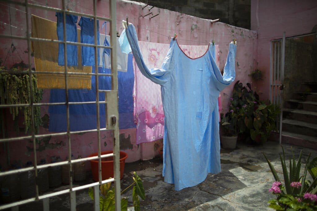 En esta imagen, tomada el 29 septiembre de 2020, uno de los dos uniformes médicos de Elena Suazo se seca al sol en la casa de sus padres en el vecindario de Catia, en Caracas, Venezuela, entre sus dos viajes diarios para atender a su padre, hospitalizado en el área para pacientes con COVID-19 del hospital público José Gregorio Hernández. Con su sueldo de empleada de cafetería no le alcanzaba para comprar el equipo de protección necesario, así que su hermano pequeño le compró uno, y la suegra de su hijo le dio el otro, lo que le permite atender a su padre dentro del centro hospitalario dos veces al día. (AP Foto/Ariana Cubillos)
