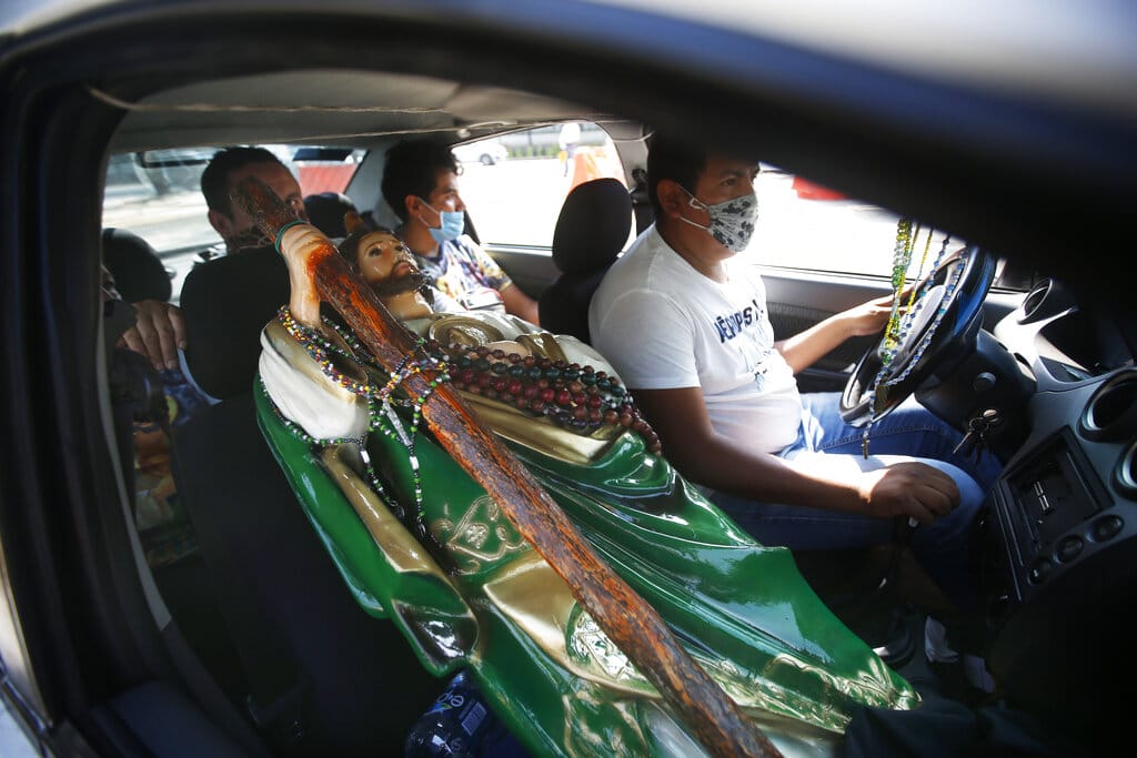 En esta imagen, tomada el 28 de octubre de 2020, una imagen de San Judas viaja en el asiento del copiloto durante una peregrinación anual en honor al patrón de las causas perdidas, en la Ciudad de México. Miles de mexicanos participaron también este año en la fiesta en honor a San Judas, aunque la pandemia obligó a cancelar las misas y los ríos de gente que se formaban otros años ante la iglesia de San Hipólito fueron reemplazados por ordenadas filas de fieles con mascarilla a la espera de su bendición. (AP Foto/Marco Ugarte)