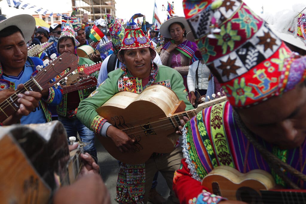 En esta imagen, tomada el 24 de octubre de 2020, músicos quechua participan en los festejos luego de que el conteo oficial declaró al izquierdista Luis Arce como ganador de las elecciones presidenciales, en El Alto, Bolivia. El conteo oficial, que terminó el viernes, dio una abrumadora victoria a Arce, una reivindicación para el partido Movimiento al Socialismo del derrocado expresidente Evo Morales, que tenía prohibido presentarse a los comicios. (AP Foto/Juan Karita)