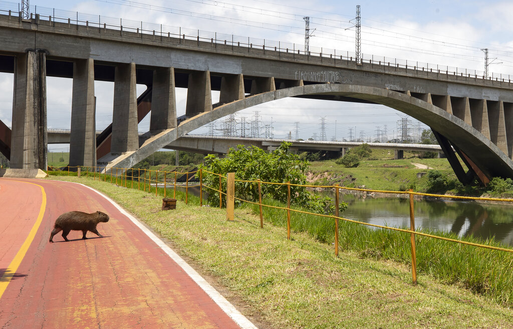 En esta imagen, tomada el 22 de octubre de 2020, una capibara cruza un carril bici a orillas del río Pinheiros, en Sao Paulo, Brasil. El río, que atraviesa el corazón de Sao Paulo, muestra su contaminación con un miasma que flota por las calles de la ciudad, asfixiando a ricos y a pobres por igual. Es una desagradable característica de la ciudad, que es la más rica de Brasil y el corazón financiero de Latinoamérica. (AP Foto/Andre Penner)