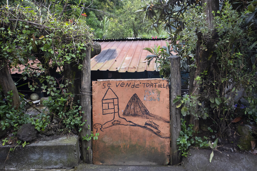 En esta imagen, tomada el 27 de octubre de 2020, la puerta de una vivienda, con un dibujo del volcán Pacaya y la frase "Se vende tortilla", cerca de la base del volcán, en Escuintla, Guatemala. Las autoridades guatemaltecas están evaluando la posibilidad de reabrir el Parque Nacional Volcán de Pacaya tras varios meses cerrado para frenar la propagación del coronavirus. (AP Foto/Moisés Castillo)