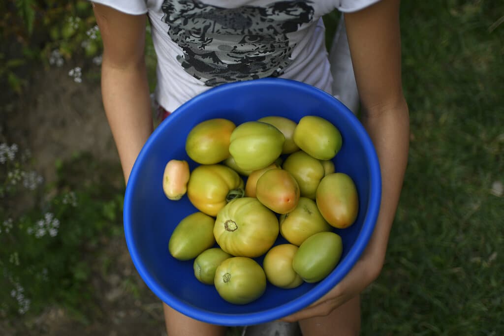 Sandra Rodríguez, de 10 años, sostiene un cuenco con tomates cosechados en el huerto urbano de su familia, en Caracas, Venezuela, el jueves 27 de agosto de 2020. Algunos se animan al cultivo urbano para aliviar tensiones en medio de una larga cuarentena decretada para contener la propagación del coronavirus. (Foto AP/Matías Delacroix)