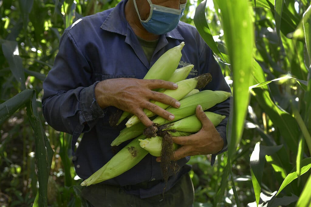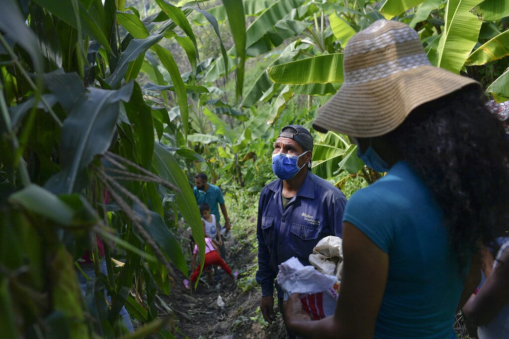 Eulices Cortez carga algunas mazorcas que acaba de cosechar el domingo 13 de septiembre de 2020 en una parcela en el vecindario La Dolorita, en Caracas, Venezuela. (AP Foto/Matías Delacroix)