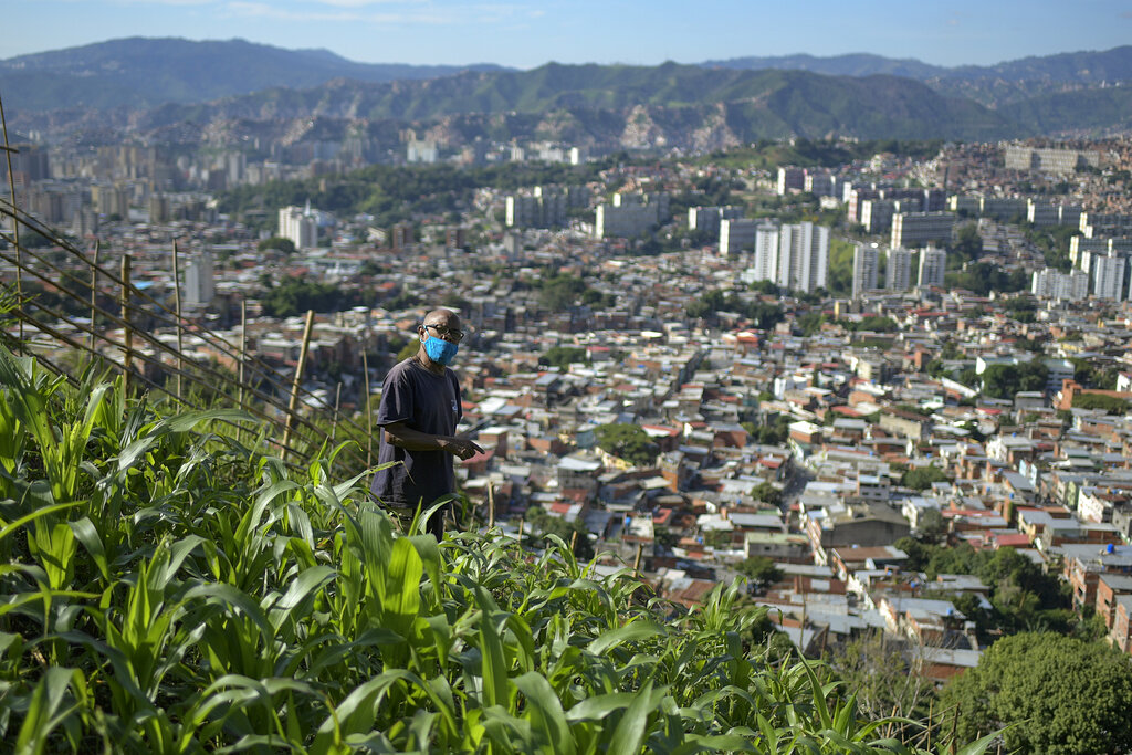 Antonio Martínez, de 67 años, se ocupa de sus cultivos en una pequeña parcela de tierra en una ladera sobre Caracas, Venezuela, el domingo 13 de septiembre de 2020. Cada vez son más las personas que ponen las manos en la tierra y siembran plantas comestibles en plena capital venezolana para aliviar sus finanzas ante los elevados precios de las hortalizas y frutas. (Foto AP/Matías Delacroix)