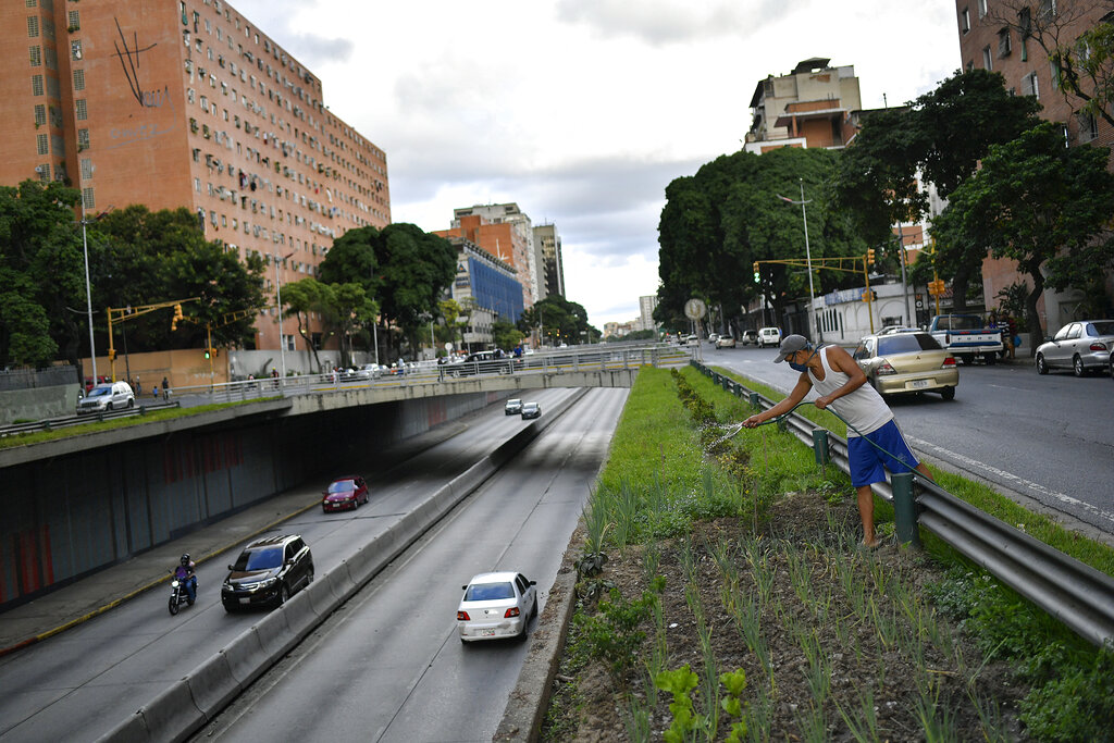 Santos Rodríguez riega su huerto urbano que plantó en un espacio junto a la Avenida Libertador, ubicada frente al edificio de departamentos donde reside en Caracas, Venezuela, el jueves 27 de agosto de 2020. (Foto AP/Matías Delacroix)