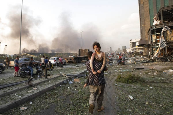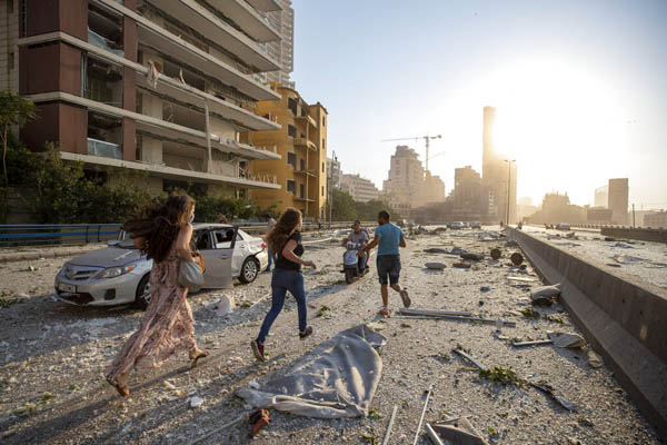 Unas personas corren luego de una explosión en Beirut, Líbano. (AP Foto/Hassan Ammar)