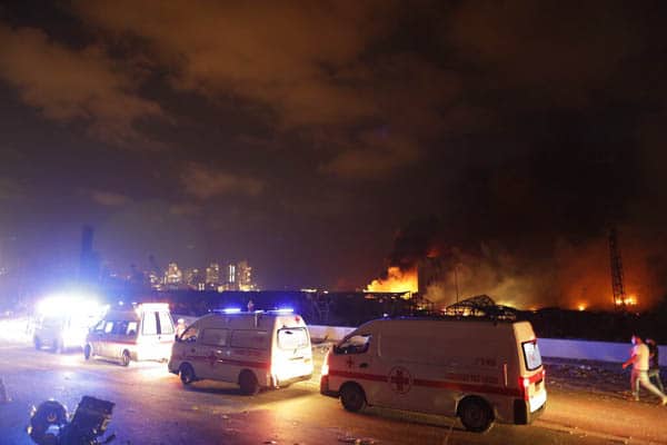 Ambulancias circulan frente al sitio de una enorme explosión en Beirut, Líbano. (AP Foto/Hassan Ammar)