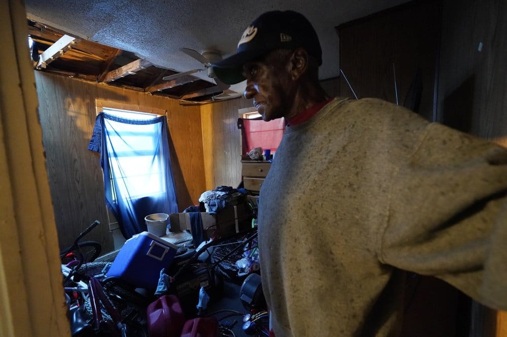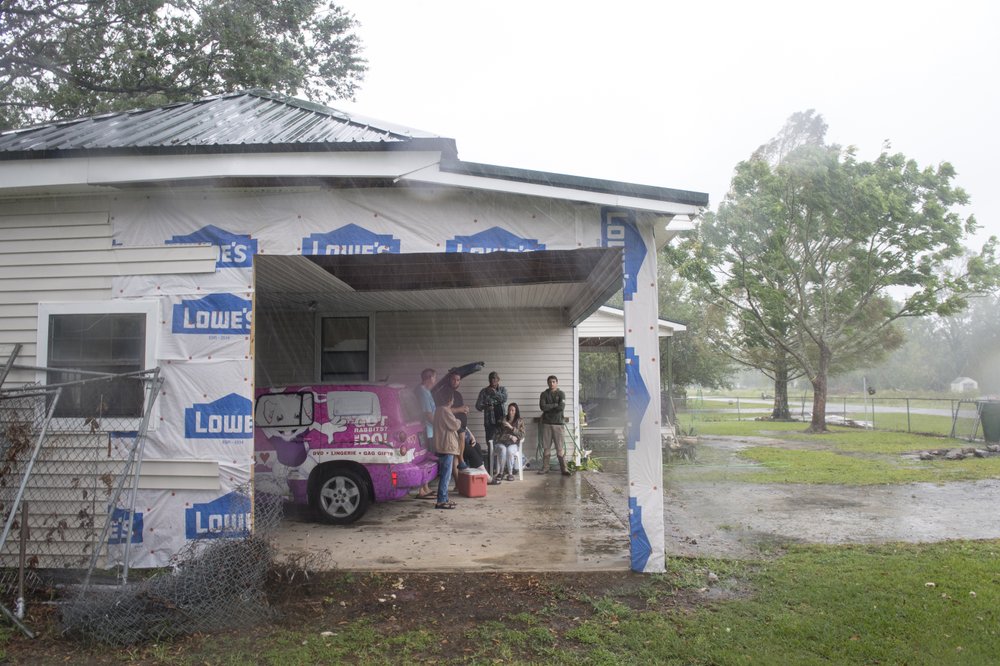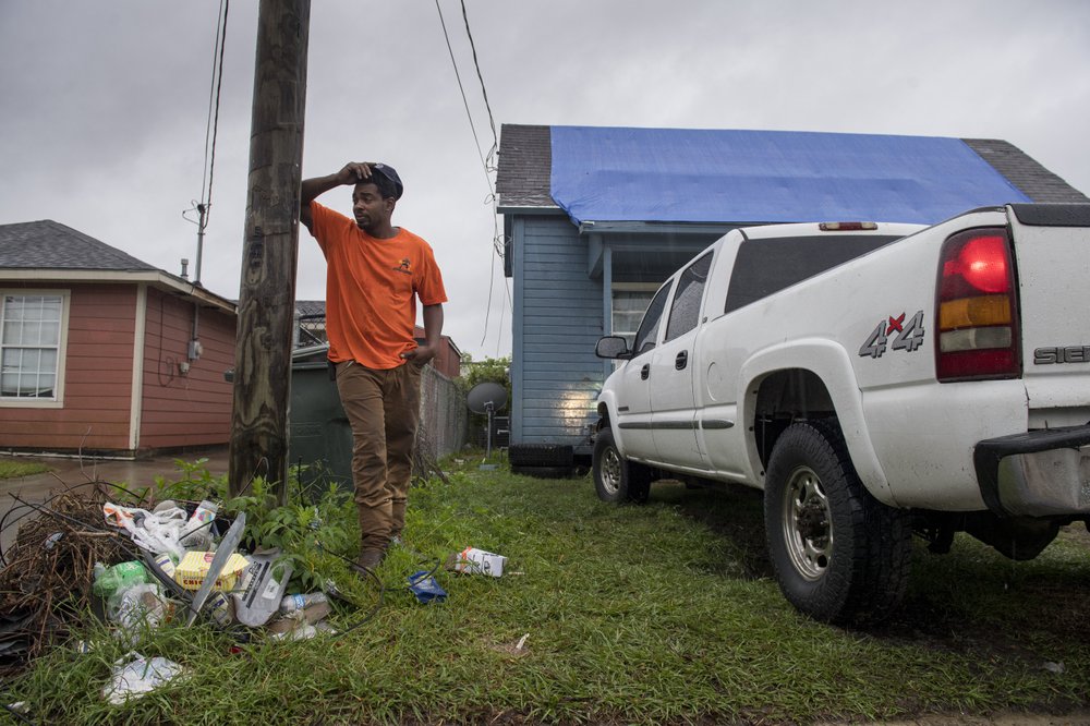 En Lake Charles, el sitio más afectado en agosto por Laura, Delta provocó que el agua se filtraba por el techo de la recámara de Ernest Jack. Afortunadamente el viento no se llevó la lona sobre el tejado de su casa desde que Laura dañó su vivienda. Ahora estaba cubierta con madera para protegerla de los nuevos escombros.