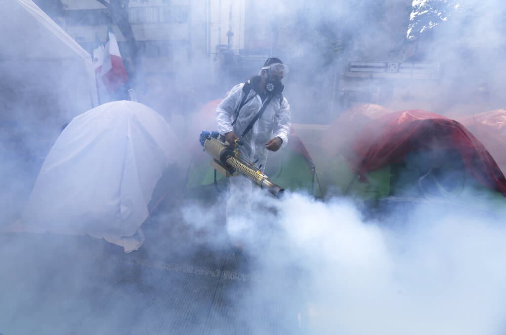 En esta imagen, tomada el 22 de septiembre de 2020, un técnico sanitario desinfecta las tiendas de campaña instaladas en la Avenida Juárez de la Ciudad de México para exigir la renuncia del presidente del país, Andrés Manuel López Obrador. Los manifestantes, organizados por el Frente Nacional Contra AMLO, el nombre por el que se conoce popularmente al mandatario, bloquean casi por completo la avenida. (AP Foto / Marco Ugarte)