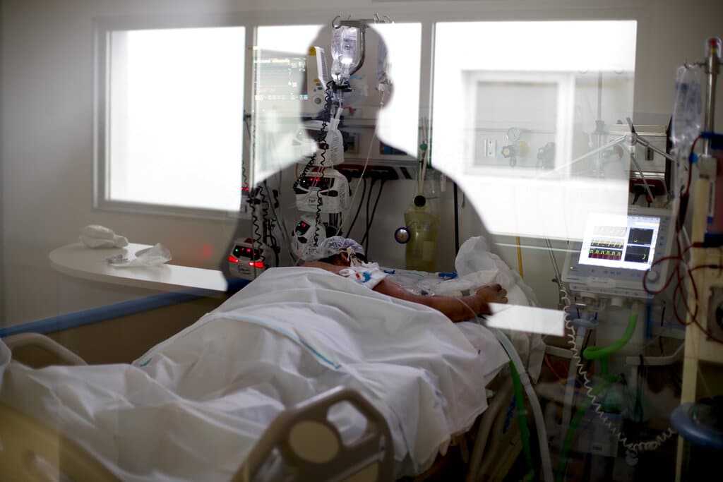En esta imagen, tomada el 15 de septiembre de 2020, la imagen de una enfermera de cuidados intensivos se refleja en una ventana mientras observa a un paciente con COVID-19, en el hospital El Cruce Dr. Néstor Carlos Kirchner, en las afueras de Buenos Aires, Argentina. Los trabajadores sanitarios argentinos advierten que están al límite mientras atienden a un creciente número de nuevos pacientes de coronavirus con recursos humanos limitados y las medidas de aislamiento se relajan. (AP Foto/Natacha Pisarenko)