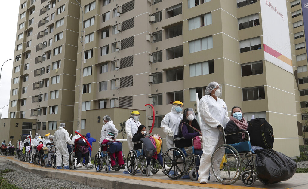 En esta imagen, tomada el 21 de septiembre de 2020, trabajadores llevan en silla de ruedas a un grupo de unos 80 pacientes con COVID-19 que, tras recibir el alta, abandonan la que fuera la villa de los deportistas durante los Juegos Paramericanos de Lima, que ahora se utiliza como hospital de campaña para atender a cientos de enfermos de coronavirus, en Lima, Perú. (AP Foto/Martín Mejía)
