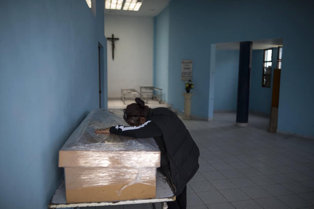 En esta imagen, tomada el 23 de septiembre de 2020, Elizabeth Alvarado, de 53 años, llora sobre el féretro de cartón con los restos mortales de su esposo, Victor Arguelles, quien murió por complicaciones relacionadas con el COVID-19, antes de su cremación en el cementerio de El Ángel, en Lima, Perú. (AP Foto/Rodrigo Abd)
