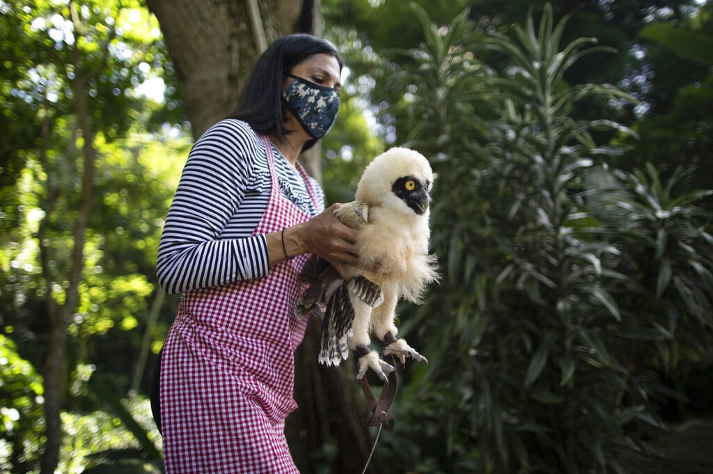 En esta imagen, tomada el 21 de septiembre de 2020, la veterinaria y ambientalista Grecia Marquis atiende a un lechuzón de anteojos que se cayó de un árbol hace tres meses deshidratado y con falta de peso, en Caracas, Venezuela. Marquis, fundadora de la fundación Plumas y Colas en Libertad, señaló que ante la gran cantidad de llamadas para reportar casos de animales heridos decidió reabrir en mayo el centro, luego de cerrarlo entre marzo y abril por la cuarentena. (AP Foto/Ariana Cubillos)