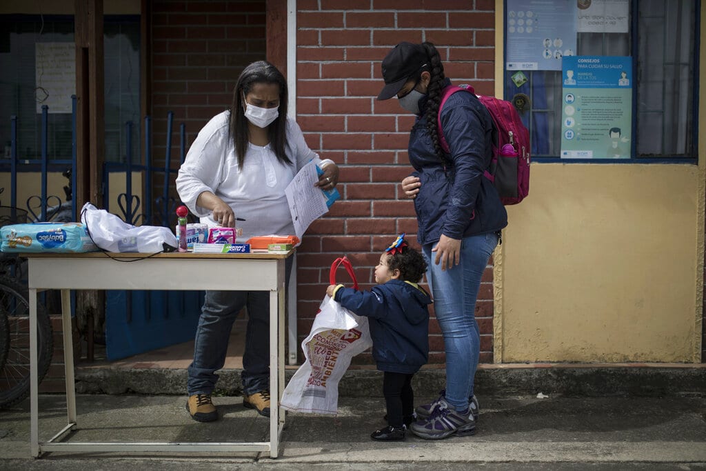 Alba Rada, residente en Colombia, entrega productos de higiene y comida a la migrante venezolana Rosmira Camacho y a su hija en el exterior de la vivienda de Rada, desde donde dirige su fundación Radaber, en Tocancipa, Colombia, el 6 de octubre de 2020. Para muchos migrantes que llegan a Colombia, la posibilidad de ganar incluso menos que el salario mínimo es un impulso. El sueldo mínimo en Colombia ronda ahora los 260 dólares, muy por encima de los apenas dos de Venezuela. (AP Foto/Iván Valencia)