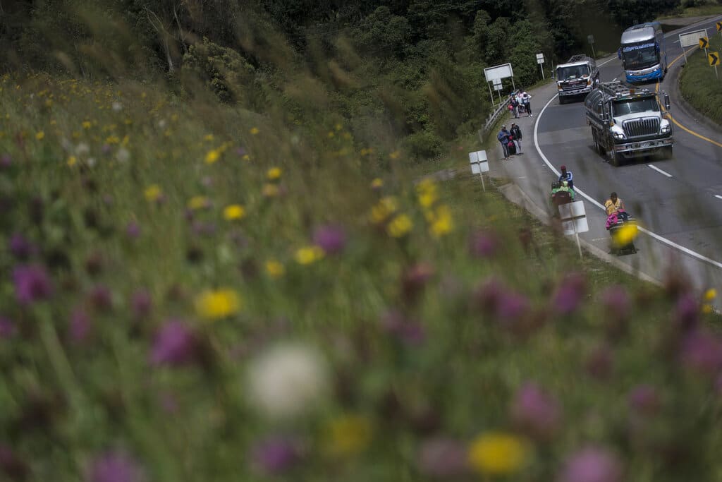 Un grupo de migrantes venezolanos que viajan a pie hacia Bogotá, a su paso por Tunja, Colombia, el 6 de octubre de 2020. La pandemia ha convertido las carreteras sudamericanas en un territorio más hostil para los migrantes pobres que no tienen dinero para boletos de buses: los albergues siguen cerrados, los conductores son más reticentes a subirlos a sus vehículos y los residentes que temen contagiarse son menos propensos a ayudar con donaciones de comida. (AP Foto/Iván Valencia)