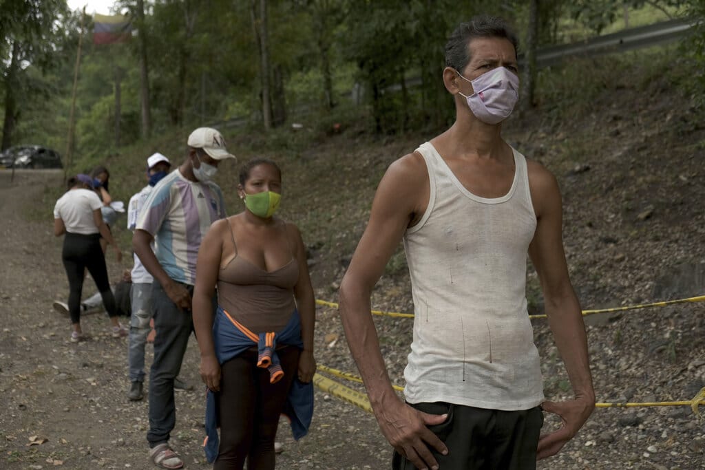 El migrante venezolano José Rivas, de 52 años, hace fila para recibir ayuda de Cruz Roja Colombia en Pamplona, Colombia, el 7 de octubre de 2020. Los nuevos migrantes se topan con condiciones mucho más adversas que aquellos que se fueron de Venezuela antes de la pandemia. (AP Foto/Ferley Ospina)