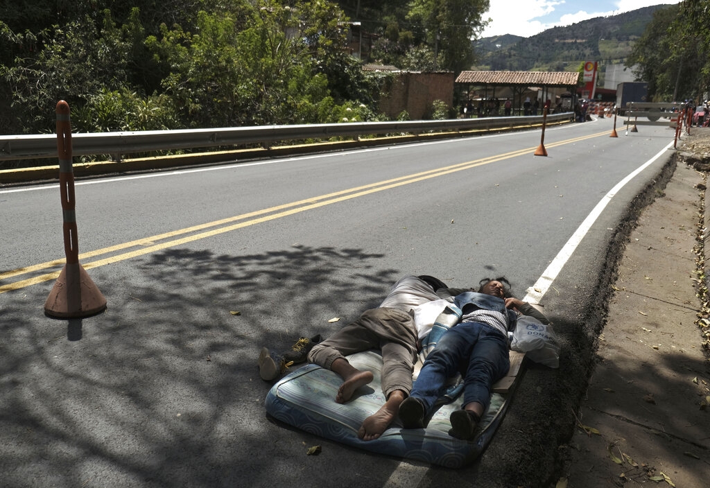 Migrantes venezolanos duermen sobre un colchón a una lado de una autopista en Pamplona, Colombia, el 7 de octubre de 2020, a unas pocas horas en coche de la frontera con Venezuela. Cuando los migrantes llegan a su destino, una nueva lista de preocupaciones se cierne sobre ellos. La tasa de desempleo en Colombia pasó del 12% en marzo a casi el 16% en agosto. Quienes no pueden permitirse pagar el alquiler están siendo desahuciados. Y para complicar aún más las cosas, más de la mitad de los venezolanos en Colombia no tienen estatus legal. (AP Foto/Ferley Ospina)