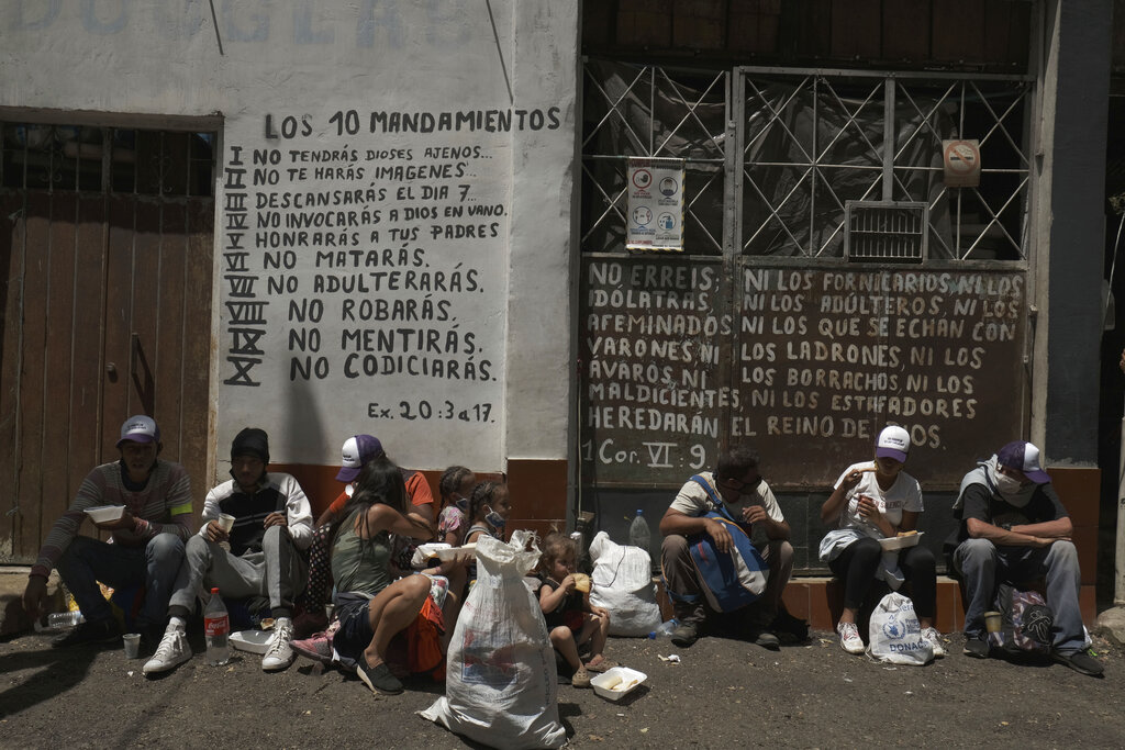 Migrantes venezolanos descansan mientras reciben comida, delante de un muro con pasajes de la Biblia, en Pamplona, Colombia, el 7 de octubre de 2020, a apenas unas horas en auto de la frontera con Venezuela. En plena pandemia del coronavirus, los albergues siguen cerrados, los conductores son más reticentes a subirlos a sus vehículos y los residentes que temen contagiarse son menos propensos a ayudar con donaciones de comida. (AP Foto/Ferley Ospina)