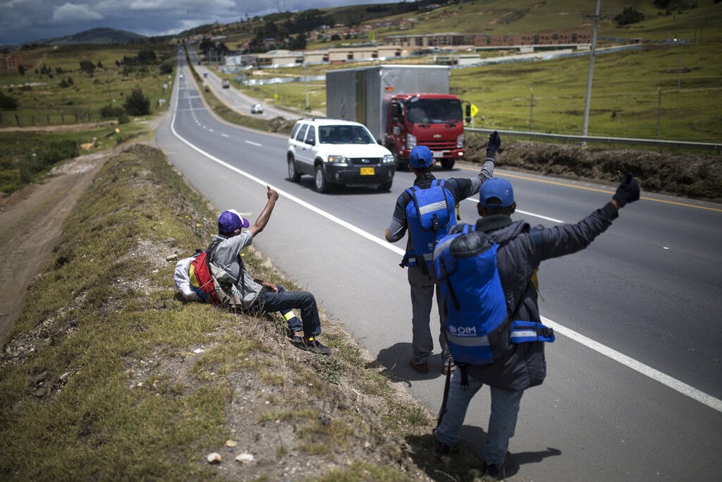 Migrantes venezolanos tratan de parar un auto para viajar hacia Bogotá, en Tunja, Colombia, el 6 de octubre de 2020. La pandemia ha convertido las carreteras sudamericanas en un territorio más hostil para los migrantes pobres que no tienen dinero para boletos de buses: los albergues siguen cerrados, los conductores son más reticentes a subirlos a sus vehículos y los residentes que temen contagiarse son menos propensos a ayudar con donaciones de comida. (AP Foto/Iván Valencia)