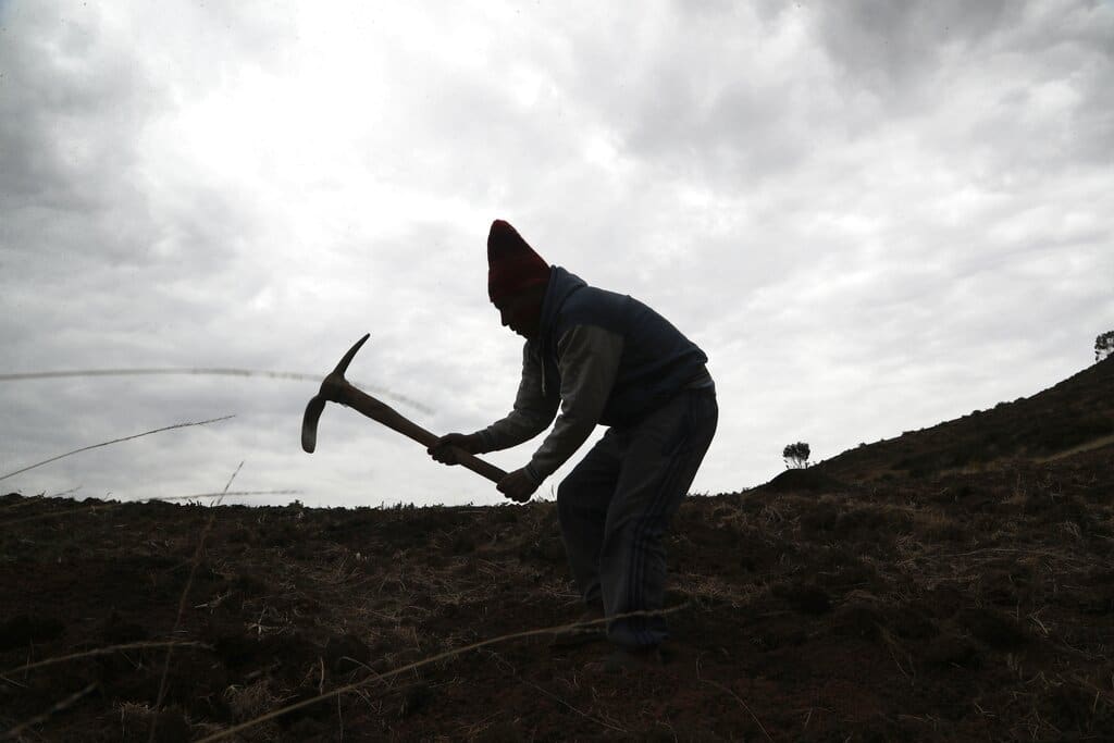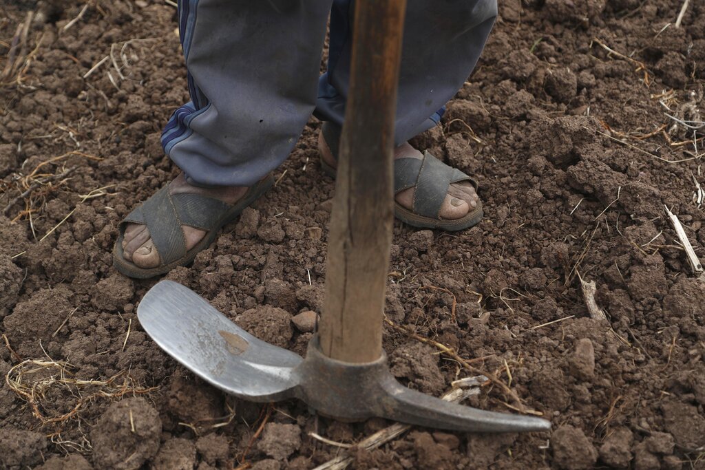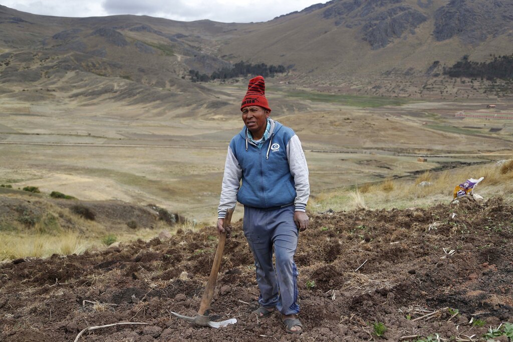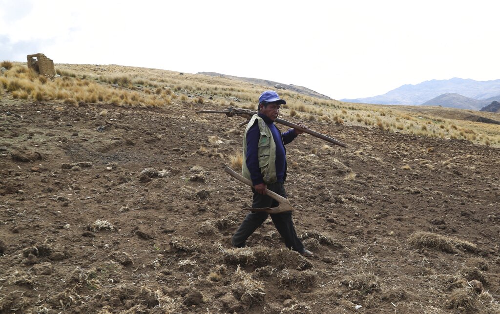 El agricultor Ciriaco Huaman usa un pico para sembrar papas, en Pisac, en el sur rural de Perú, el viernes 30 de octubre de 2020. (AP Foto/Martín Mejía)
