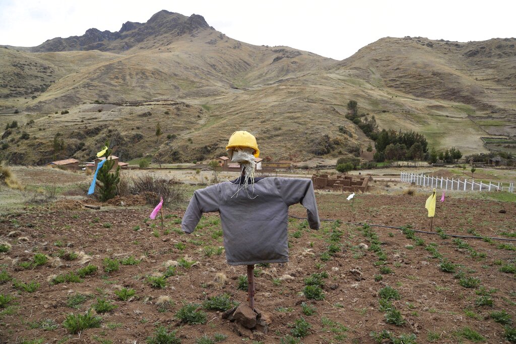 Un espantapájaros con un casco de plástico se encuentra en un campo de papa para disuadir a las aves en Pisac, el sur rural de Perú, el viernes 30 de octubre de 2020. (AP Foto/Martín Mejía)