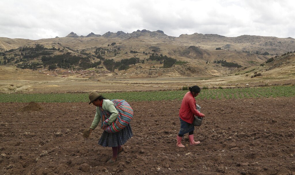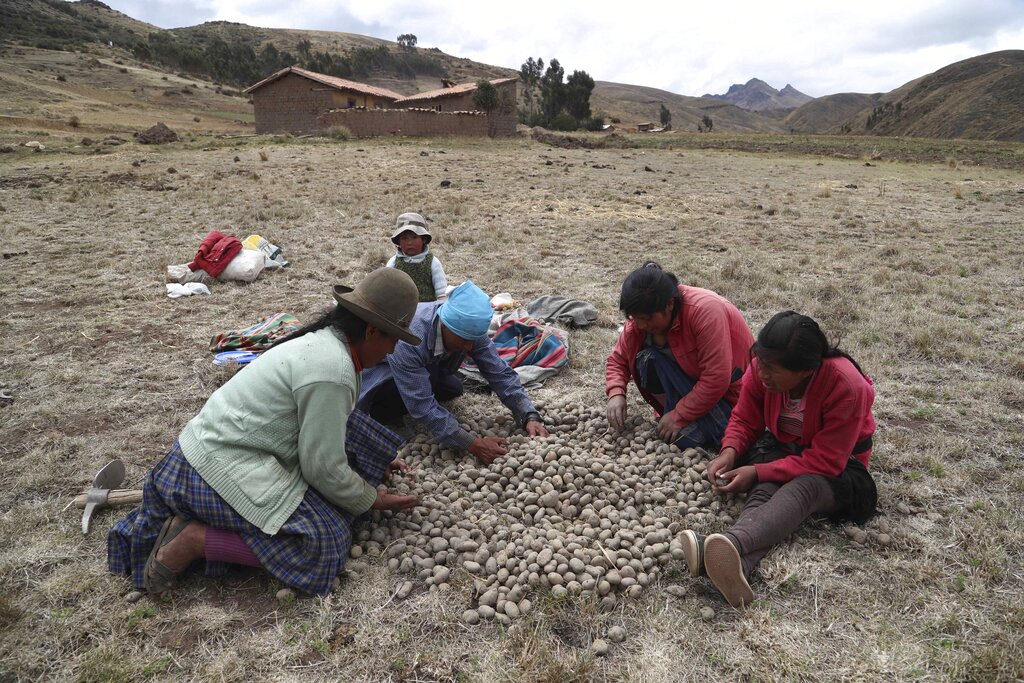 Mujeres siembran papas en un campo en Pisac, en la zona rural del sur de Perú, el viernes 30 de octubre de 2020. (AP Foto/Martín Mejía)