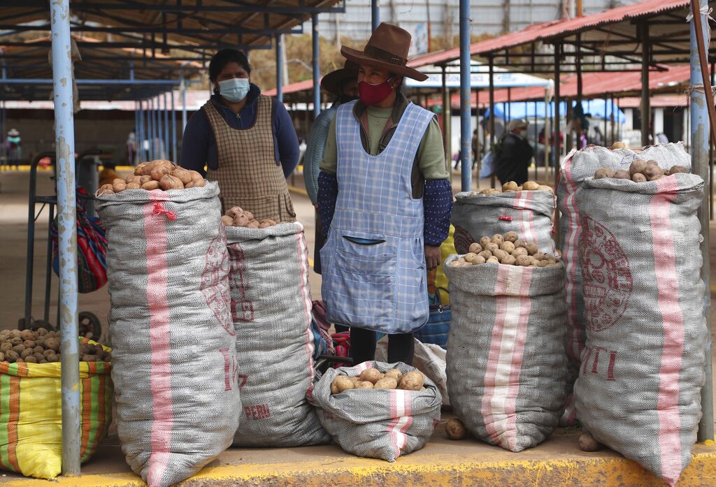 La productora de papa Herlinda lluac, en el centro, espera a los clientes en un mercado en Cusco, Perú, el sábado 31 de octubre de 2020. (AP Foto/Martín Mejía)
