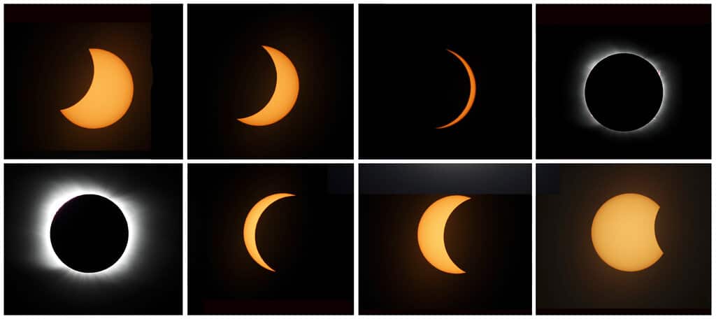 Esta combinación de fotos muestra la secuencia de un eclipse de sol visto desde Piedra del Águila, Argentina, el lunes, 14 de diciembre del 2020. El eclipse total fue visible desde el norte de la región de la Patagonia, Argentina; y desde la Sraucaia, en Chile; y como eclipse parcial en la parte baja de Sudamérica. (AP Foto/Natacha Pisarenko)