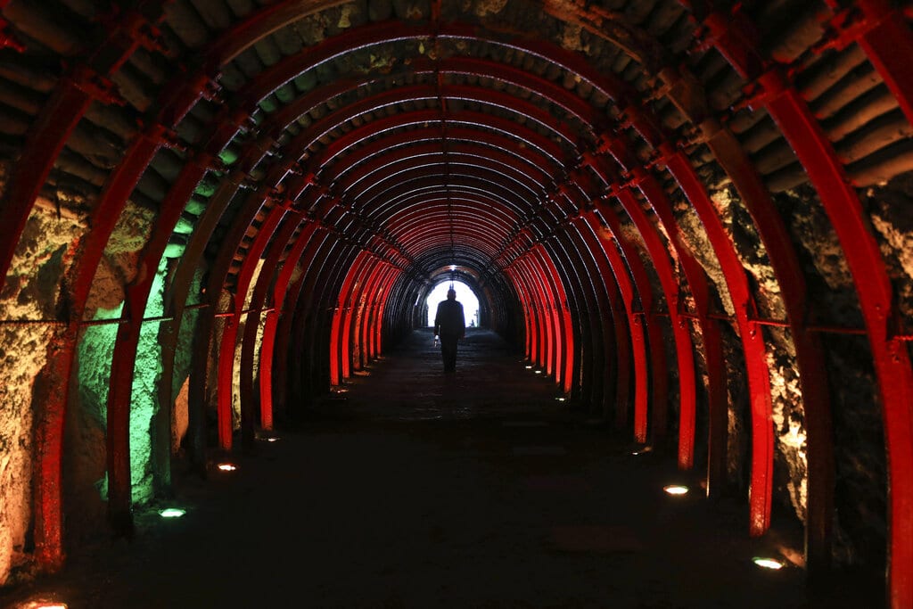 Un hombre concluye una visita a la Nueva Catedral de Sal en Zipaquira, Colombia, el miércoles 16 de diciembre del 2020. Considerada la primera Maravilla de Colombia, el sitio arquitectónico, religioso y minero celebra sus primeros 25 años de historia en el 2020. (AP Foto/Fernando Vergara)
