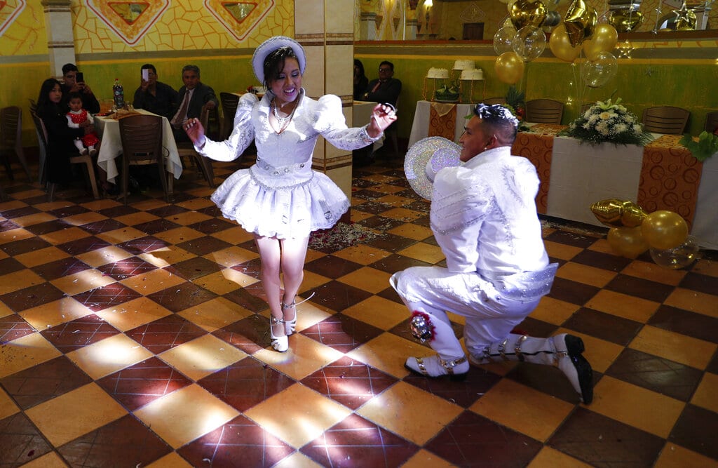 Los recién casados Ana Vallejos y Yamil Salcedo bailan la danza tradicional andina "Caporales" en su boda, el sábado, 12 de diciembre del 2020. Como medida para reactivar la economía, el gobierno boliviano levantó restricciones contra el coronavirus. Eventos deportivos, religiosos y culturales pueden realizarse públicamente hasta mediados de enero. (AP Foto/Juan Karita)