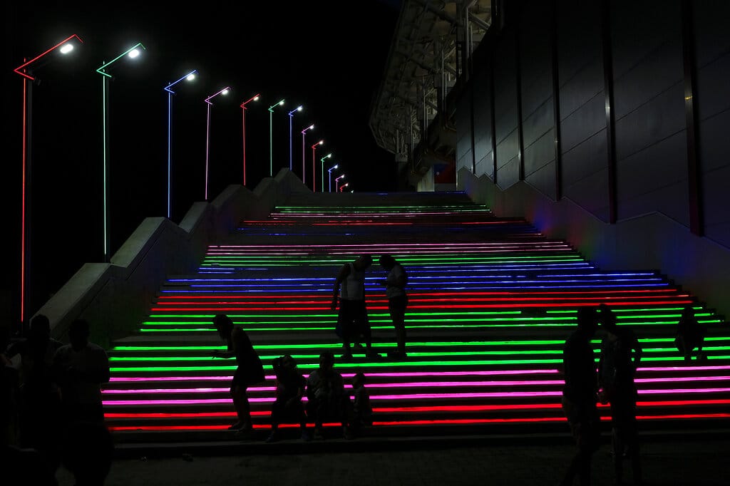 Personas disfrutan escaleras con luces multicolores en un estadio de béisbol en La Guaira (Venezuela) el sábado, 12 de diciembre del 2020. en medio de la pandemia de coronavirus. (AP Foto/Matias Delacroix)