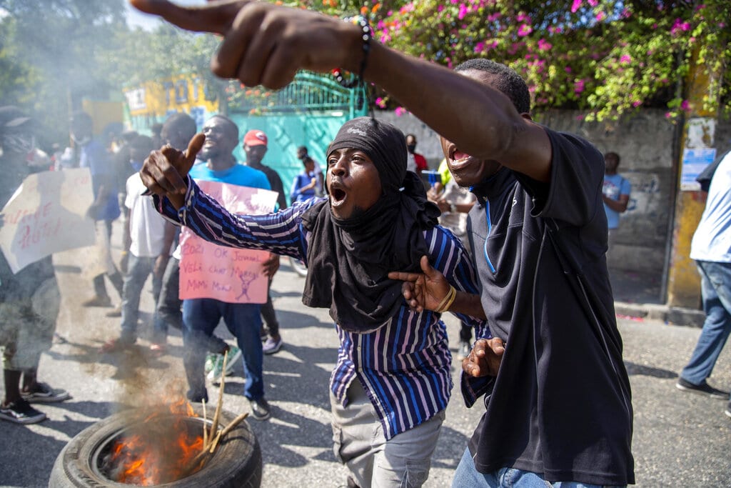 Manifestantes corean lemas antigobierno durante una protesta en demanda de la excarcelación de los prisioneros políticos y la renuncia del presidente Jovenel Moise, en Puerto Príncipe, Haití, el miércoles, 16 de diciembre del 2020. (AP Foto/Dieu Nalio Chery)