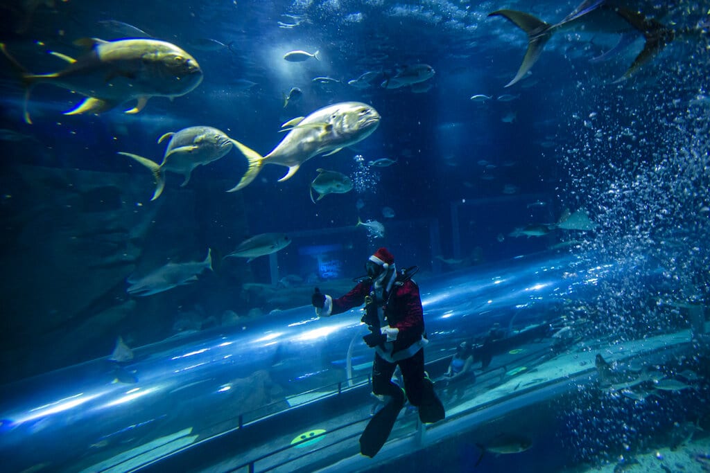 El cuidador Felipe Luna, vestido como Santa Claus nada dentro de un tanque en el acuario AquaRio en Rio de Janeiro, Brasil, el sábado, 12 de diciembre del 2020. Para llamar la atención hacia la importancia de de proteger la vida marina, empleados vestidos de Santa Claus se sumergirán diariamente para alimentar a los tiburones hasta el día de Navidad. (AP Foto/Bruna Prado)