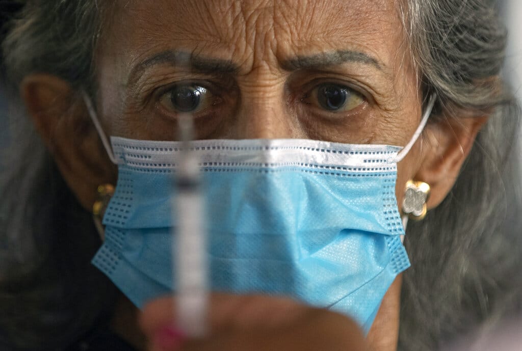 Una mujer observa la jeringa con la que le administrarán la vacuna contra el COVID-19 desarrollada por Sinovac, en un puesto de vacunación al que se puede acceder en auto habilitado en el estado de fútbol de Pacaembú, dentro del programa de inmunización prioritario para mayores, en Sao Paulo, Brasil, el 3 de marzo de 2021. (AP Foto/Andre Penner)
